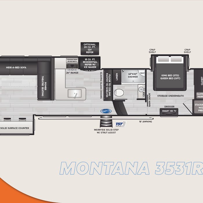 After making its debut at America's Largest RV Show in Hershey, PA, the Montana 3531RE quickly became a fan favorite. Under 39 ft in length, this floorplan maximizes space and offers an open-concept layout connecting the rear entertainment area with a massive L-shaped sectional to a gourmet kitchen. The kitchen boasts ample storage, expansive countertops, and top-notch appliances. Upstairs, a luxurious bathroom complements the roomy bedroom equipped with a king-sized bed and a full front closet including washer/dryer prep.