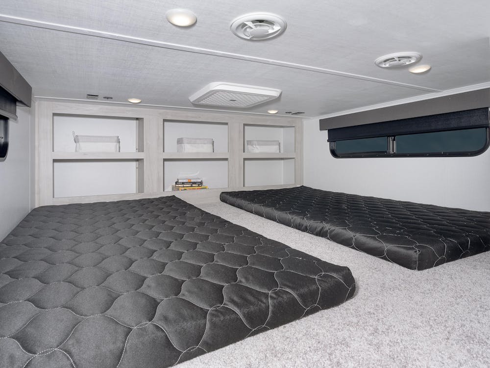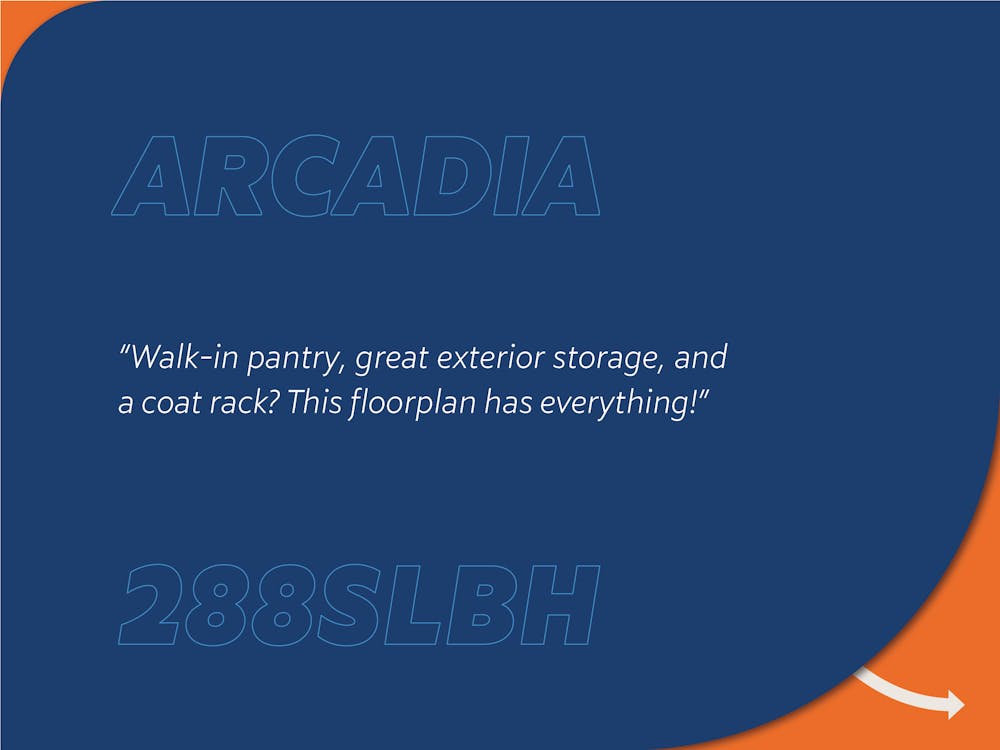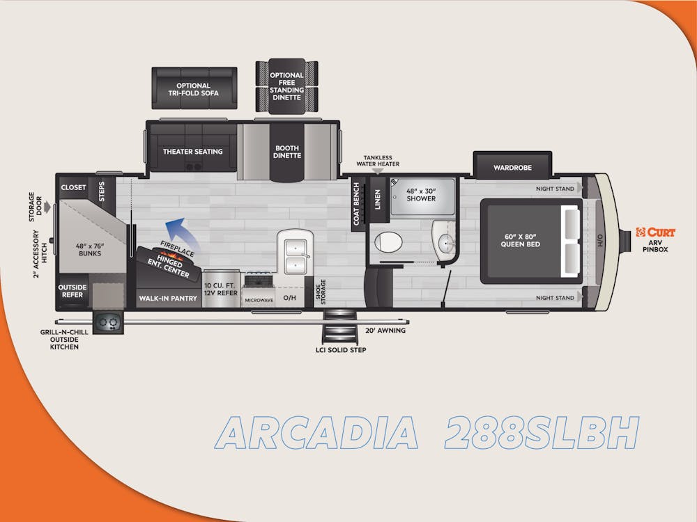 - Arcadia Super Lite 288SLBH - Extra large rear bunks that double as rear storage, large walk-in pantry, wardrobe slide, and outdoor kitchen