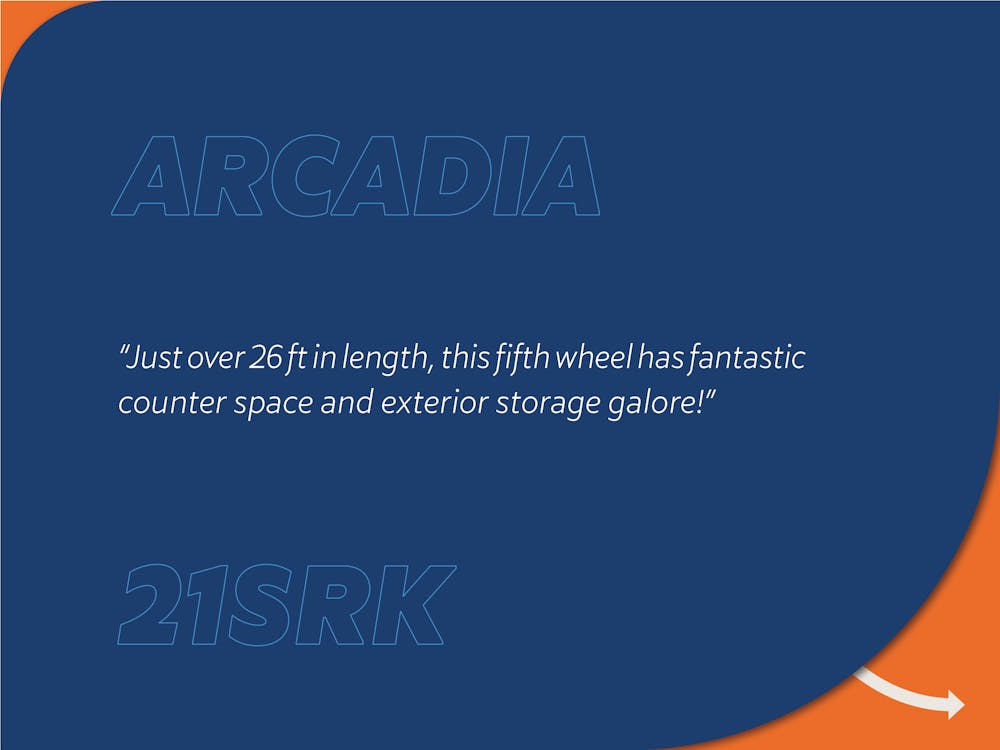 A new brand type for both Arcadia and Cougar, Arcadia Select and Cougar Sport both offer ultra-affordable fifth wheels at an unbeatable price point. These fifth wheels give owners everything that they need to get out for any adventure. Whether you're retiring and looking to downsize or begin your fifth wheel adventures, these easy-to-tow budget-friendly floorplans could be a great choice for you!