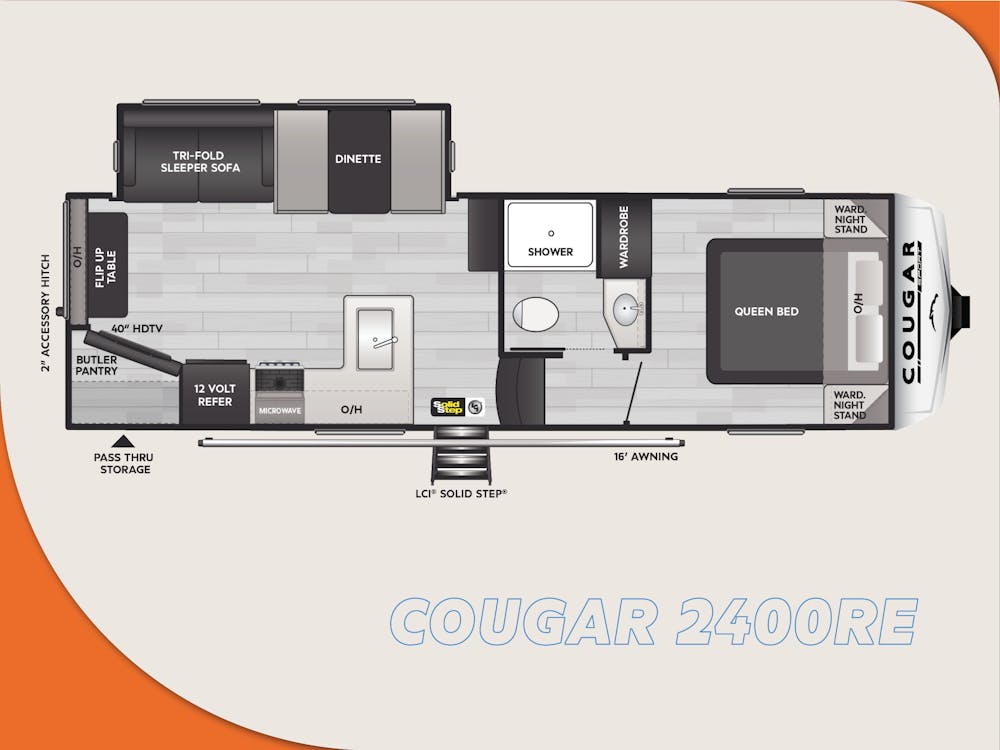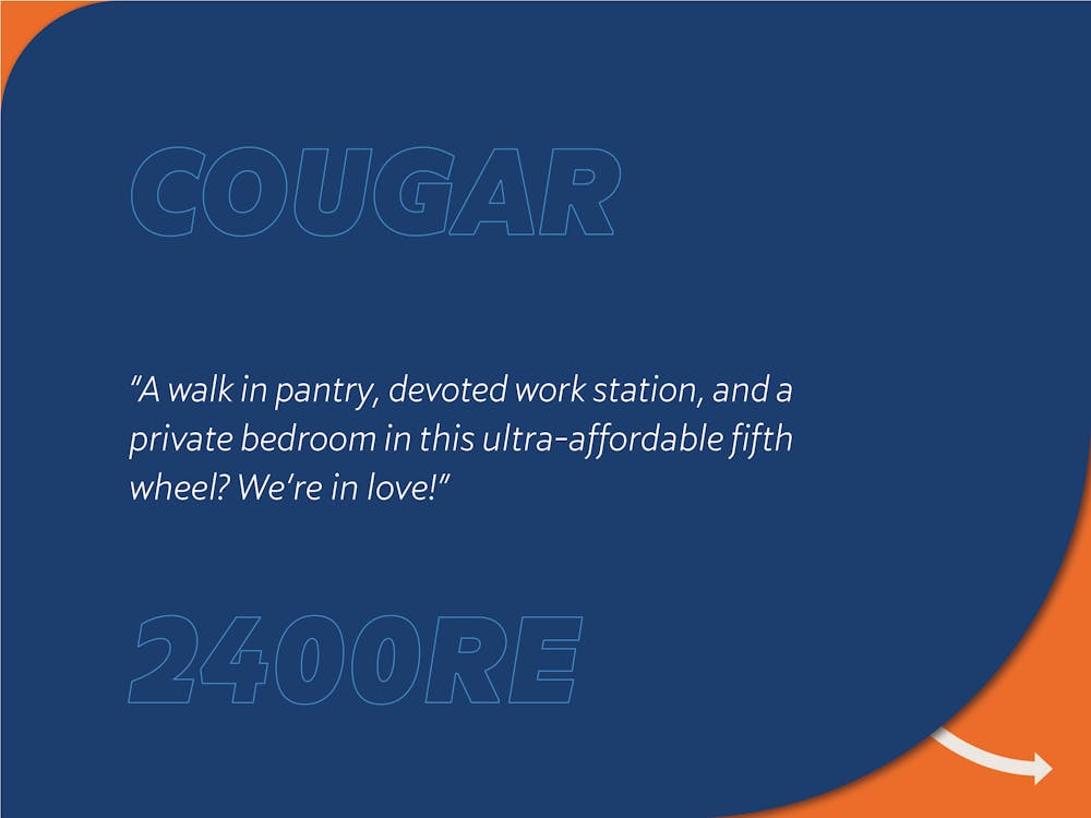 - Cougar Sport 2400RE - Brand new for 2024, this affordable fifth wheel features a walk-in pantry, great exterior storage, and a private bedroom