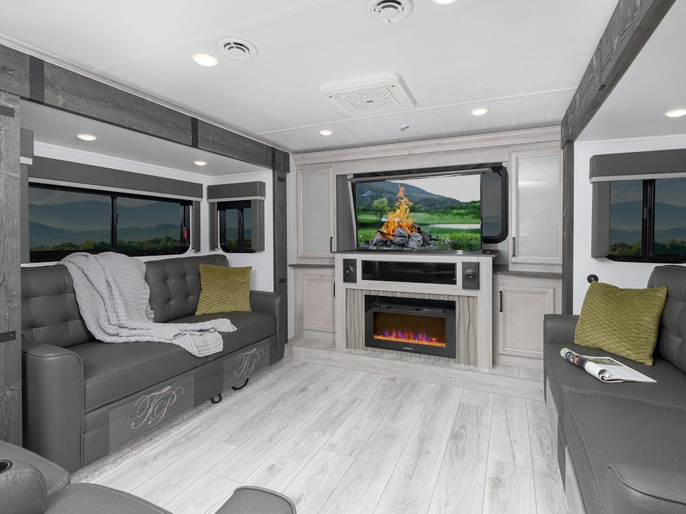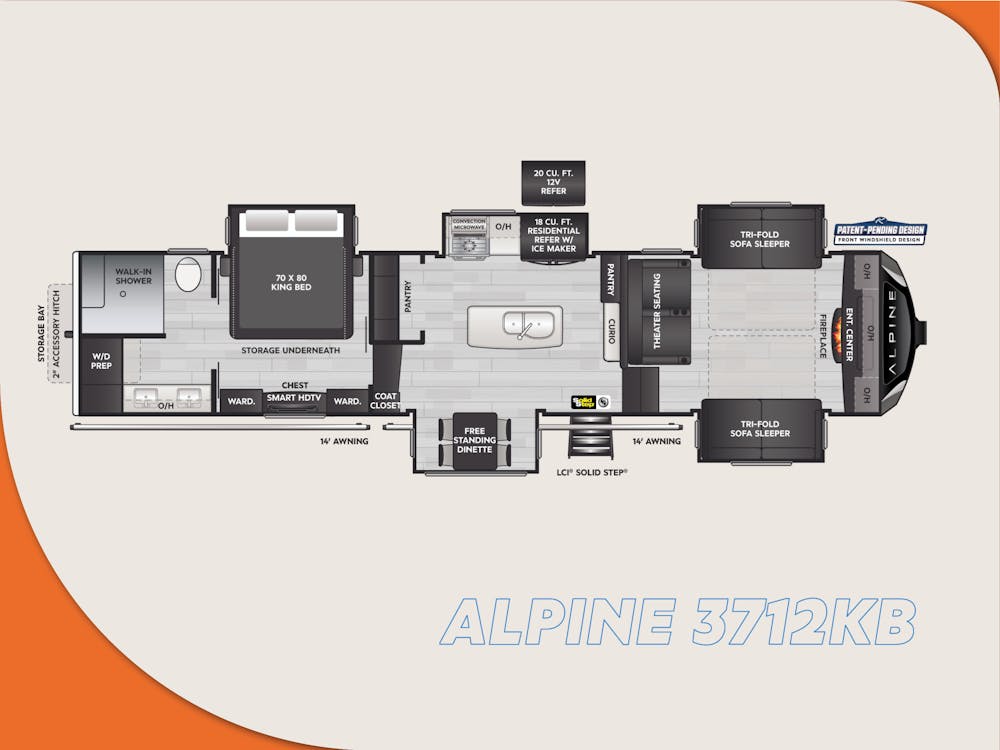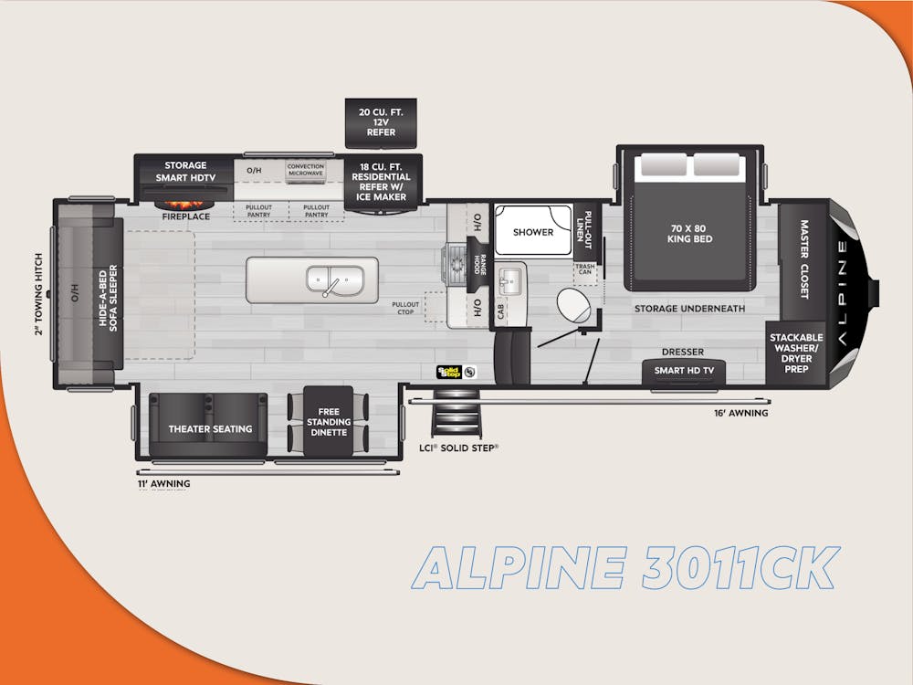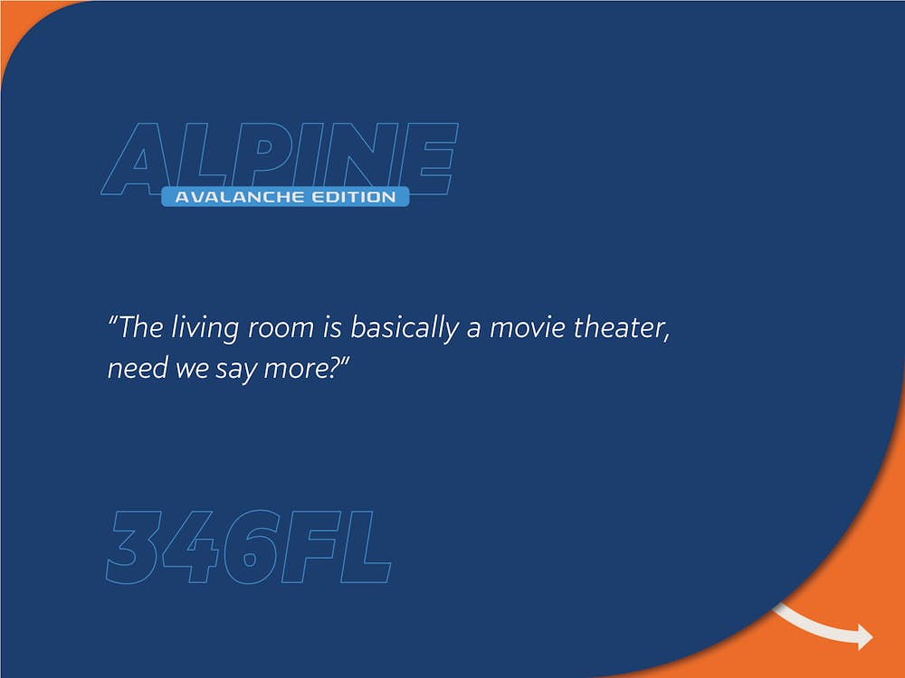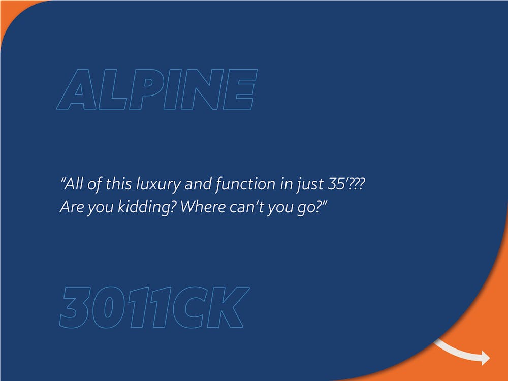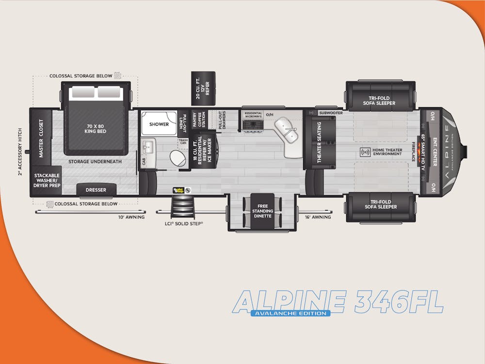- Alpine Avalanche Edition 346FL - Front living with 65" TV, open concept kitchen, rear king bed suite, and colossal exterior storage