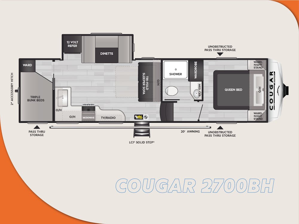 - Cougar Sport 2700BH - Private bunk room with triple bunks, large passthrough storage, and private main bedroom