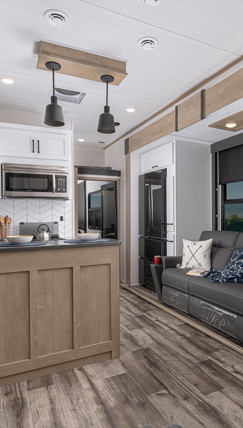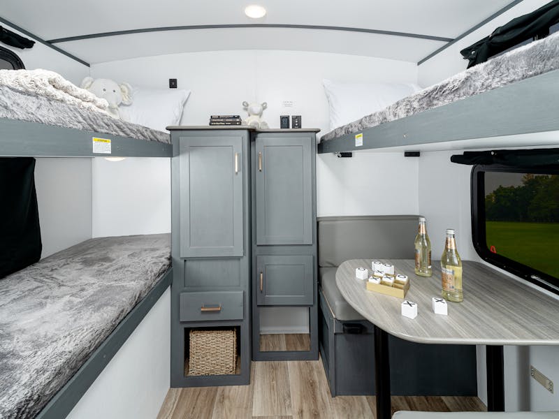 The 29BHL was inspired by both the 24RDS couple’s Half-Ton 5th wheel and the 30BHS bunkhouse Half-Ton travel trailer. Like its sister models, the 29BHL's living area is the ultimate in versatility. A bench ottoman with storage can provide extra seating at the dinette or can shift in front of the sofa where it is a footrest. Similarly, the freestanding dinette table can be placed next to the sofa as a TV tray or coffee table, be used in the kitchen extra counter space, or be taken outside for campsite entertaining.