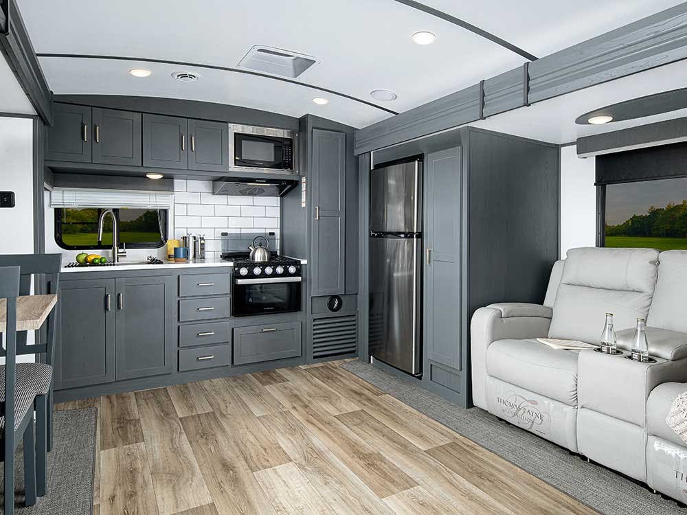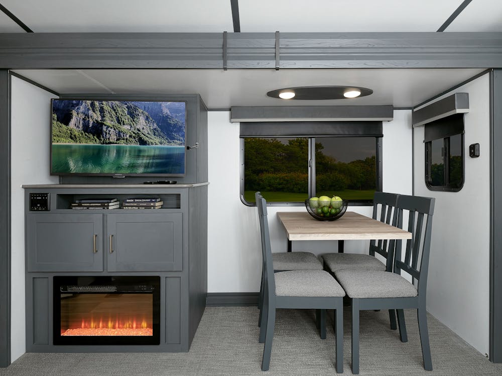 Product manager, Nick Sweazy, made great use of the space by adding double slides to the main living area giving owners tons of walking room and space for additional seating when hosting guests. He also added large windows by the dinette and soda to show off the gorgeous camping views and let natural light in. The rear kitchen embraces practicality with a large pantry and plenty of cabinets and drawers. Adjacent to the kitchen is the free-standing dinette that really levels up the space with a homey feel. The trifold sofa or optional luxury cinema recliners are directly across from the entertainment center featuring an electric fireplace and TV giving owners the perfect TV viewing angle.
