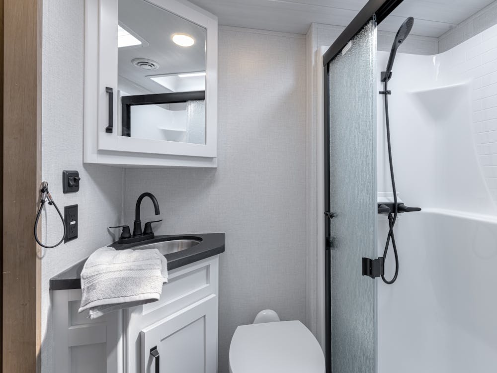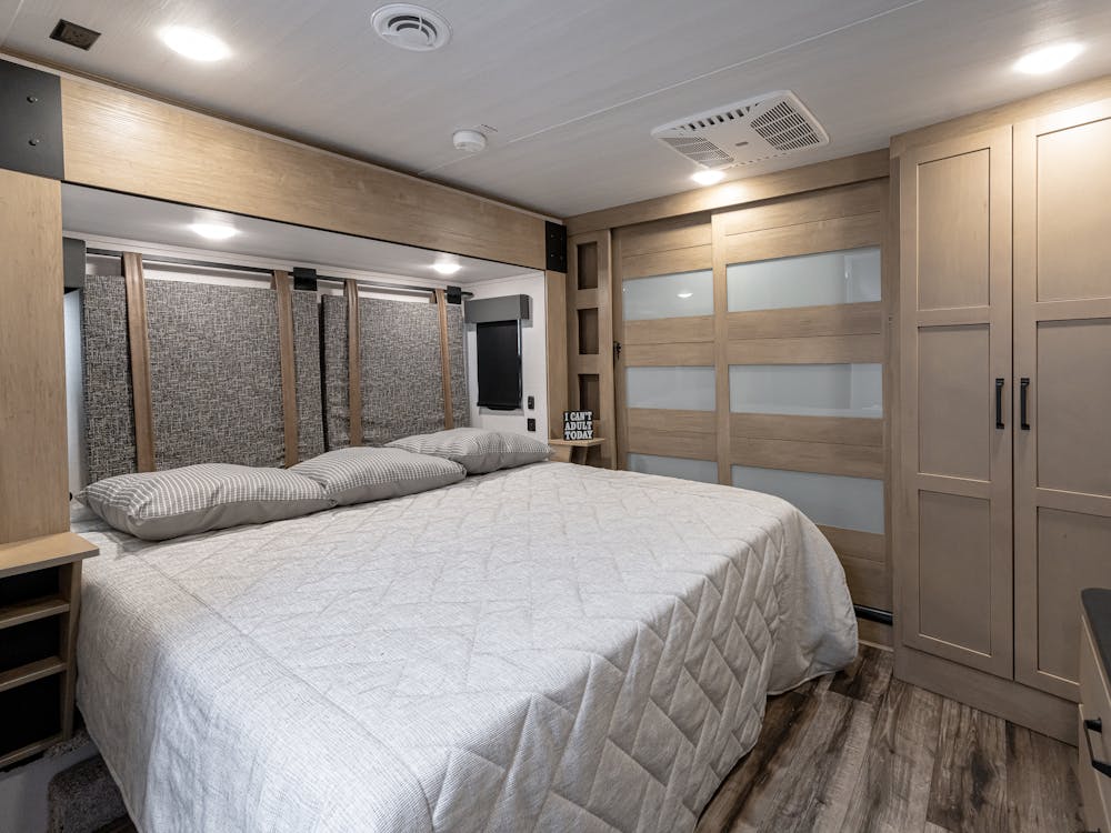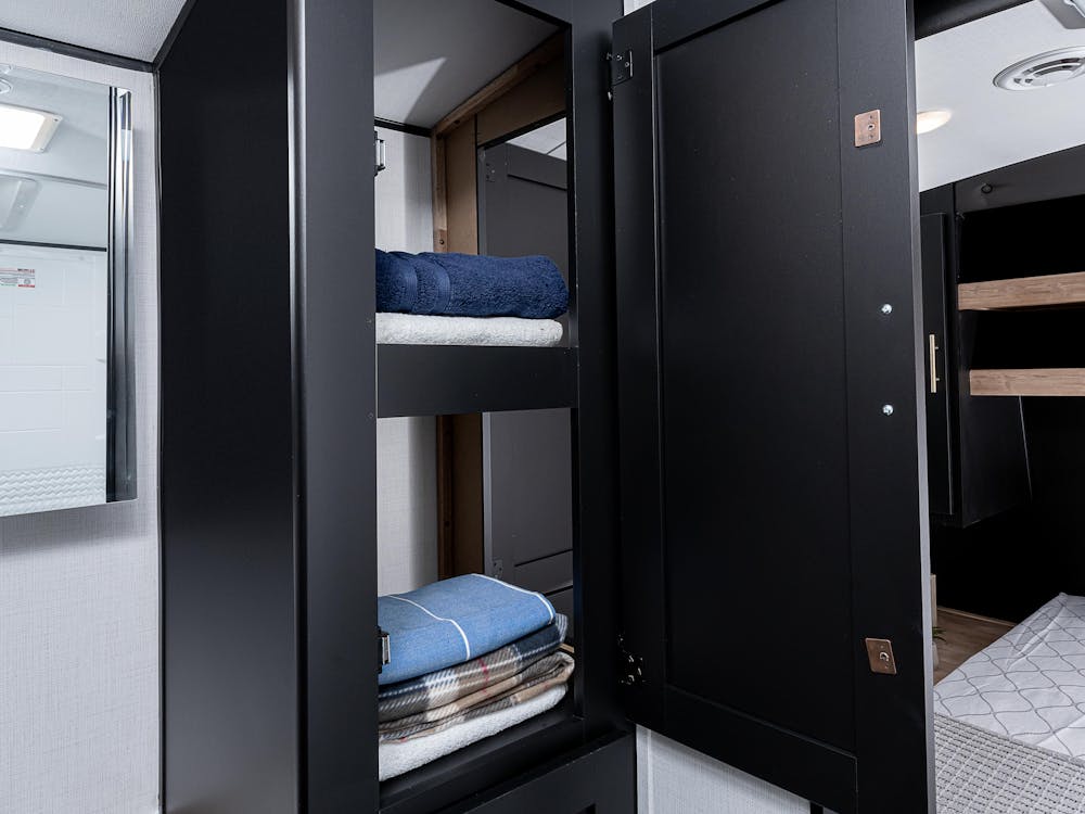 The primary suite takes advantage of High Country’s extended bed slide, adding a huge bathroom closet with W/D hookups and placing a wide dresser with flanking wardrobes underneath the fan-favorite panoramic front windshield.