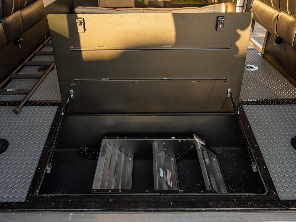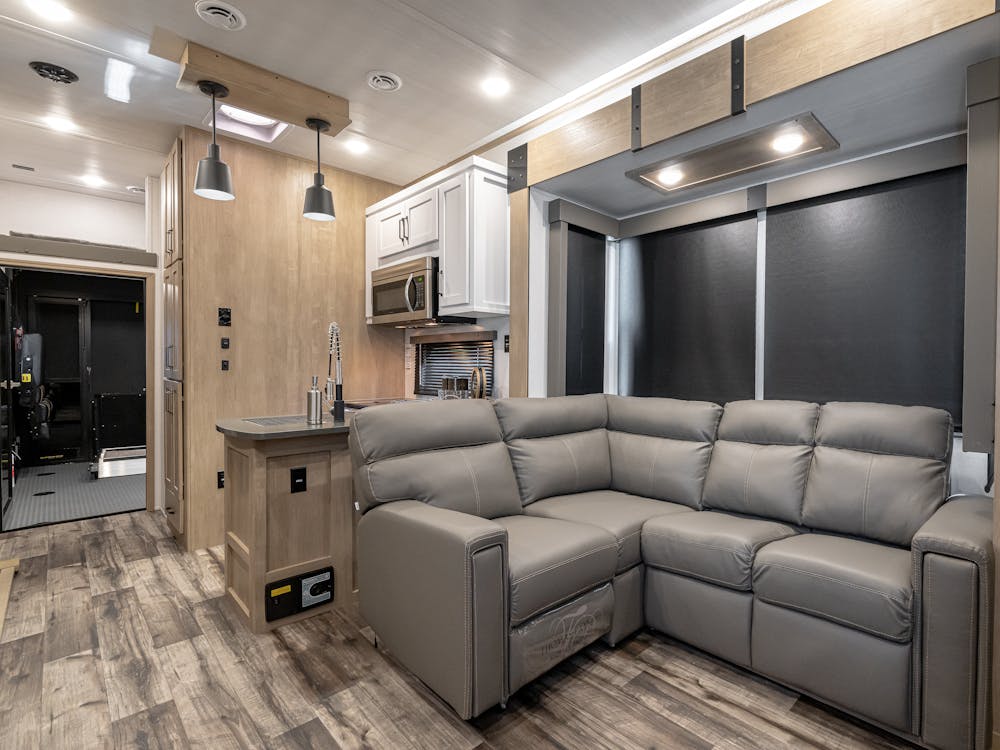 Raptor is paving the way with another innovative floorplan to the industry, the all-new 2023 Raptor 431 clocks in at 44’ 11” – the brand’s longest model. Product manager Colin Clark took advantage of the extra length to shuffle the Raptor 431’s camp-side slide layout – pulling the recliners forward and nearly tripling the size of the pantry. In a category where living space is typically awkward at best, this creates a comfortable cross-conversational layout with the recliners nested into the L-shaped sofa. The entertainment center includes the obligatory giant flatscreen television and new Kicker sound system with 2 amplifiers, 8” upgraded speakers, and subwoofer.