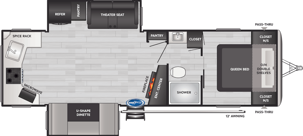 Who doesn’t love a private main bedroom that is away from the hustle and bustle? The Passport 2700RL has the perfect combination of privacy and entertaining space. This couples coach is Passport’s only dual entrance floorplan which offers owners their own bedroom oasis in the front of the coach. This just over 32 ft floorplan offers a passthrough bathroom that separates the bedroom from the main living space. The main living space embraces entertaining friends and family with plenty of seating options between the large tri-fold sofa, theater seats, and dinette. The built-in entertainment center gives owners an electric fireplace and built-in TV, perfect for a cozy movie night or watching the big game. The kitchen also offers owners plenty of storage options and a good amount of counter space. Looking around the entire coach, you’ll notice that storage is not limited to the kitchen. Coining the name “Swiss Army Knife of RVs”, Passport puts an emphasis on maximizing every square inch of space with storage.