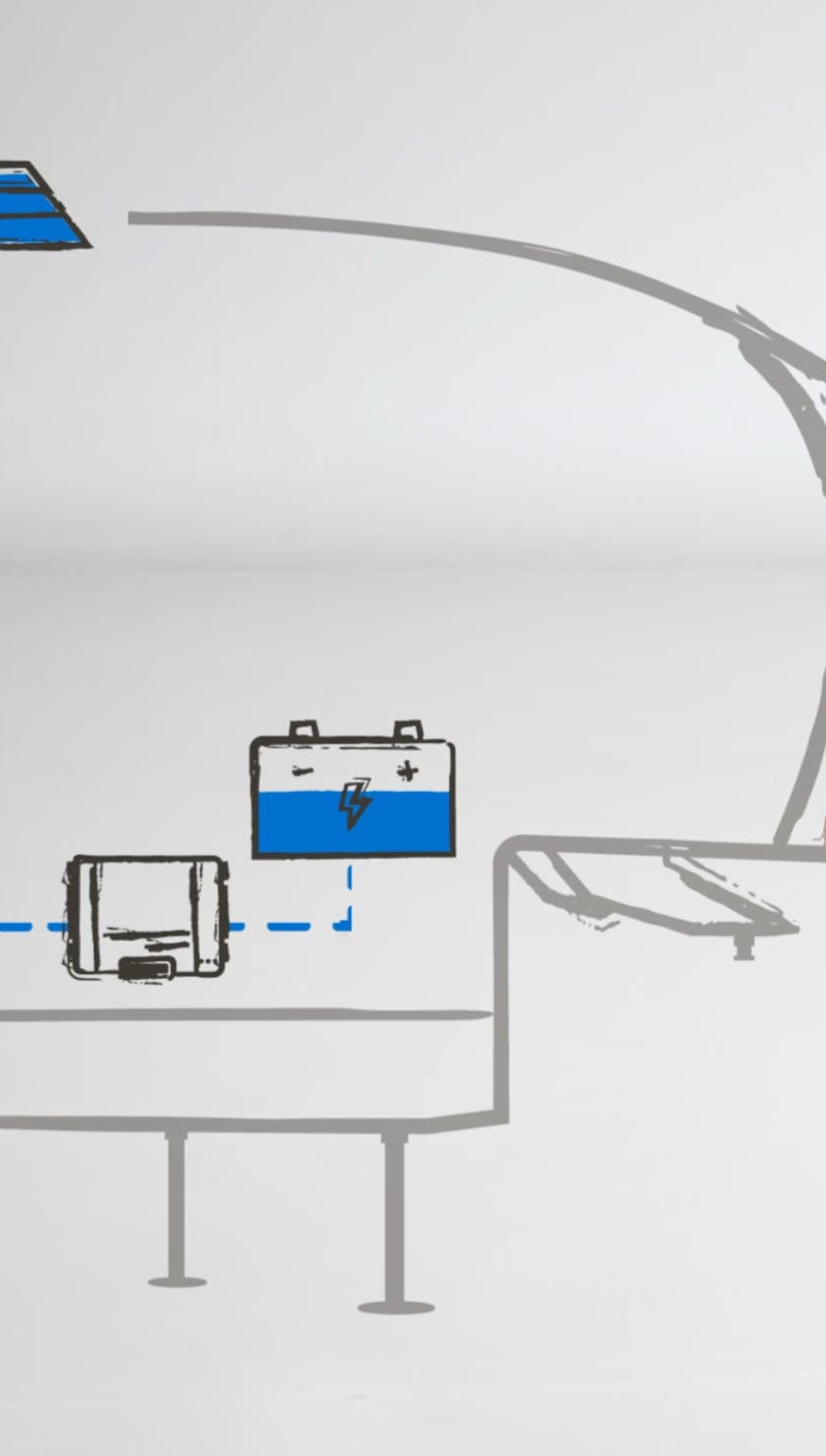 - Energy is converted to usable power and stored in your RV's battery.