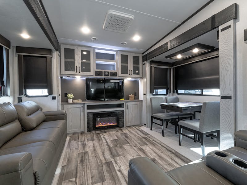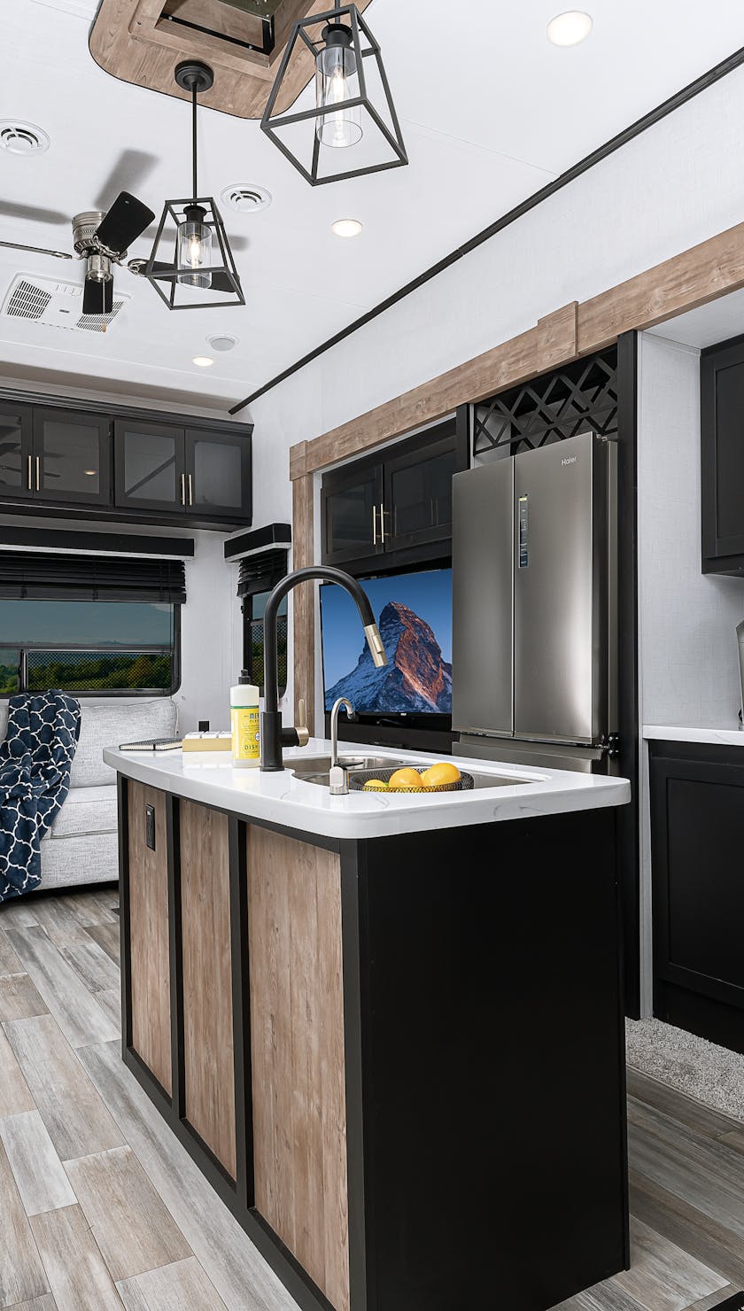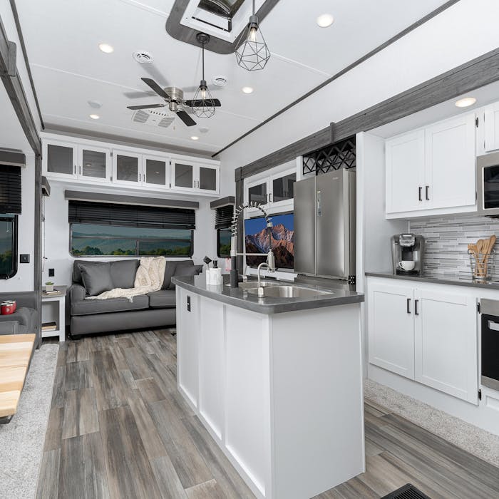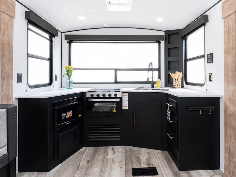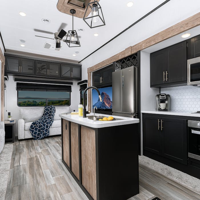 Cozy up in Retreat's new 2023 decor, Gunmetal. Stepping inside, you're greeted with bright white cabinetry coupled with black and gray accents throughout the coach. This modern design combines elegance and a comfortable feel that is perfect for any seasonal home.