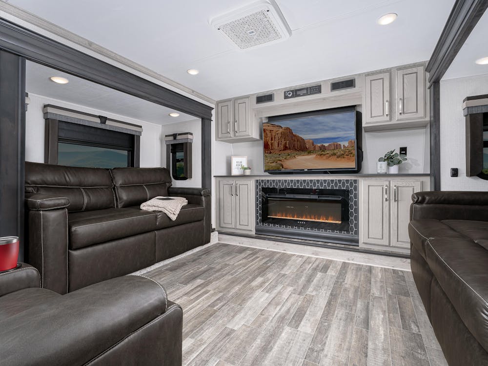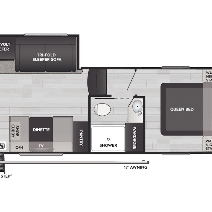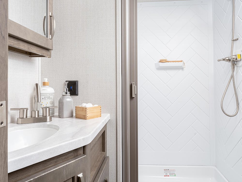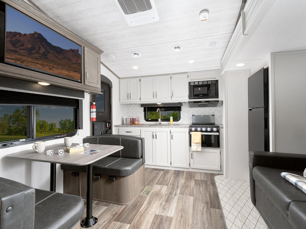 Sprinter may be an underrated brand, but their 100" wide body, modern décor, and towing stability are what makes this flagship brand truly stand out. The Sprinter 360RLS is inspired by the 3190RLS, this floor plan is a rear living floor plan that is made with your comfort in mind. Perfect for couples on the go, the bathroom has dual vanity sinks, and it can be accessed from the living area so that if you have guests over they don't have to go through the bedroom to go inside. Even better, even with the slides in, your bathroom is still accessible. The recliner seating with massage will be your favorite when chilling inside. With plenty of windows, you'll love the natural light that filters through on those beautiful sunny days!