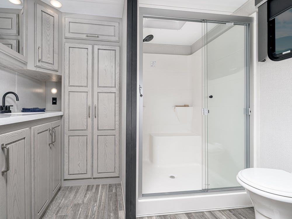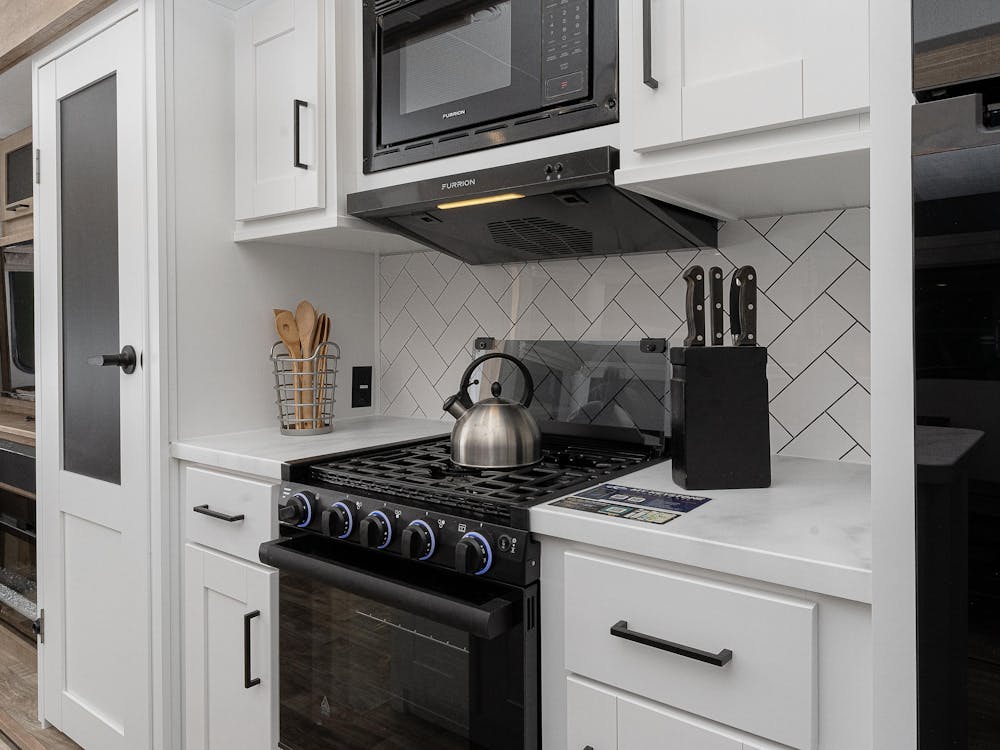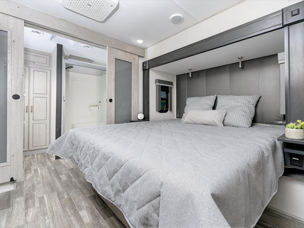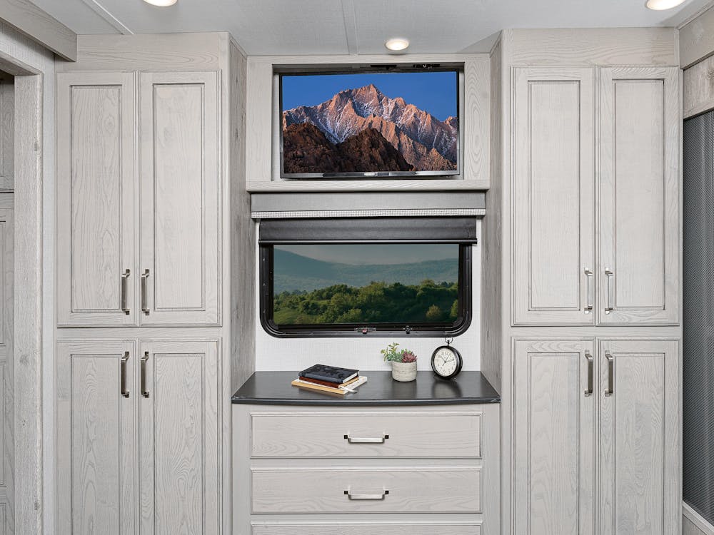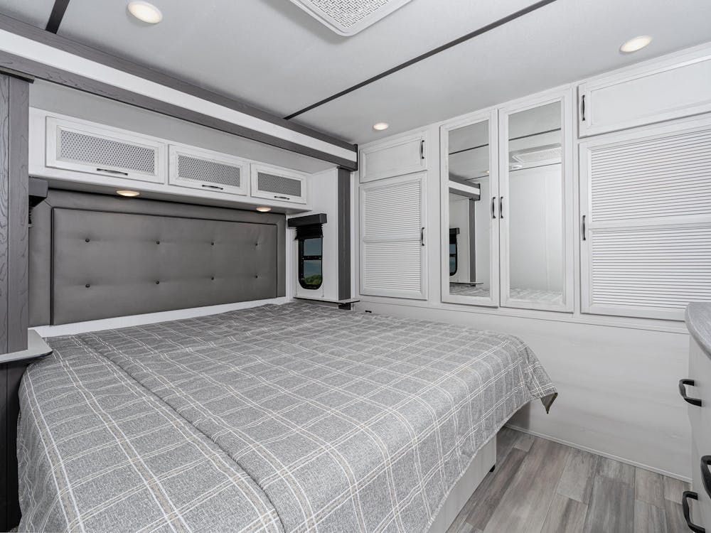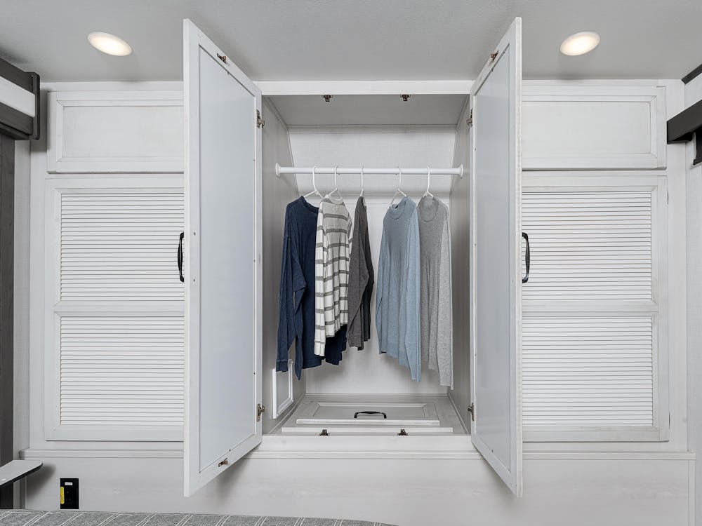 Who doesn’t love a private main bedroom that is away from the hustle and bustle? The Passport 2700RL has the perfect combination of privacy and entertaining space. This couples coach is Passport’s only dual entrance floorplan which offers owners their own bedroom oasis in the front of the coach. This just over 32 ft floorplan offers a passthrough bathroom that separates the bedroom from the main living space. The main living space embraces entertaining friends and family with plenty of seating options between the large tri-fold sofa, theater seats, and dinette. The built-in entertainment center gives owners an electric fireplace and built-in TV, perfect for a cozy movie night or watching the big game. The kitchen also offers owners plenty of storage options and a good amount of counter space. Looking around the entire coach, you’ll notice that storage is not limited to the kitchen. Coining the name “Swiss Army Knife of RVs”, Passport puts an emphasis on maximizing every square inch of space with storage.