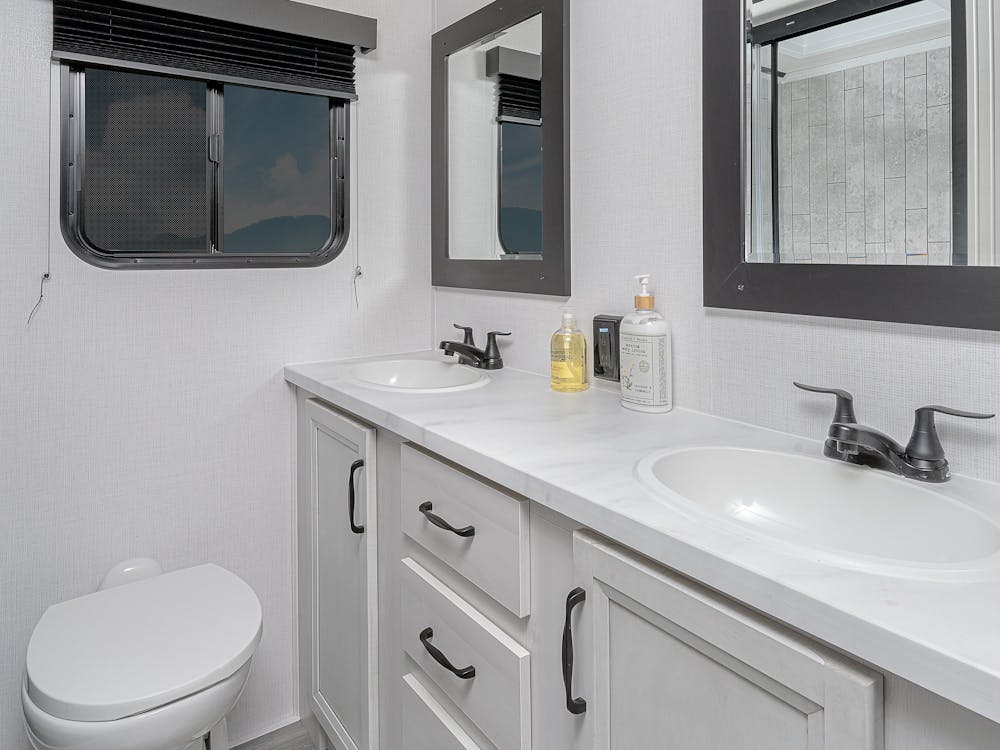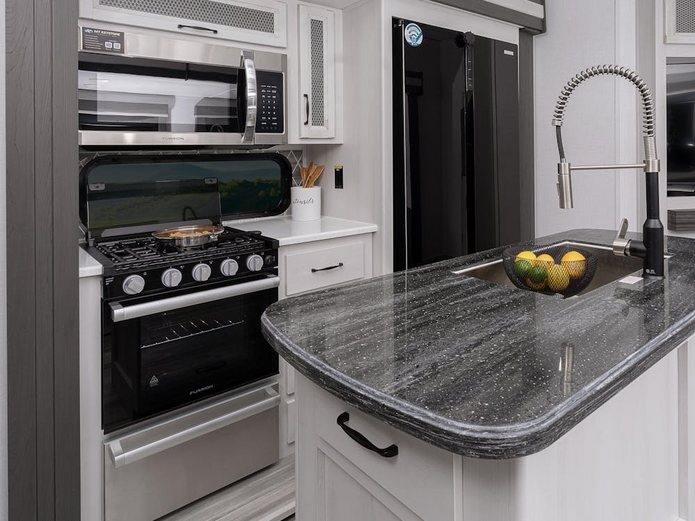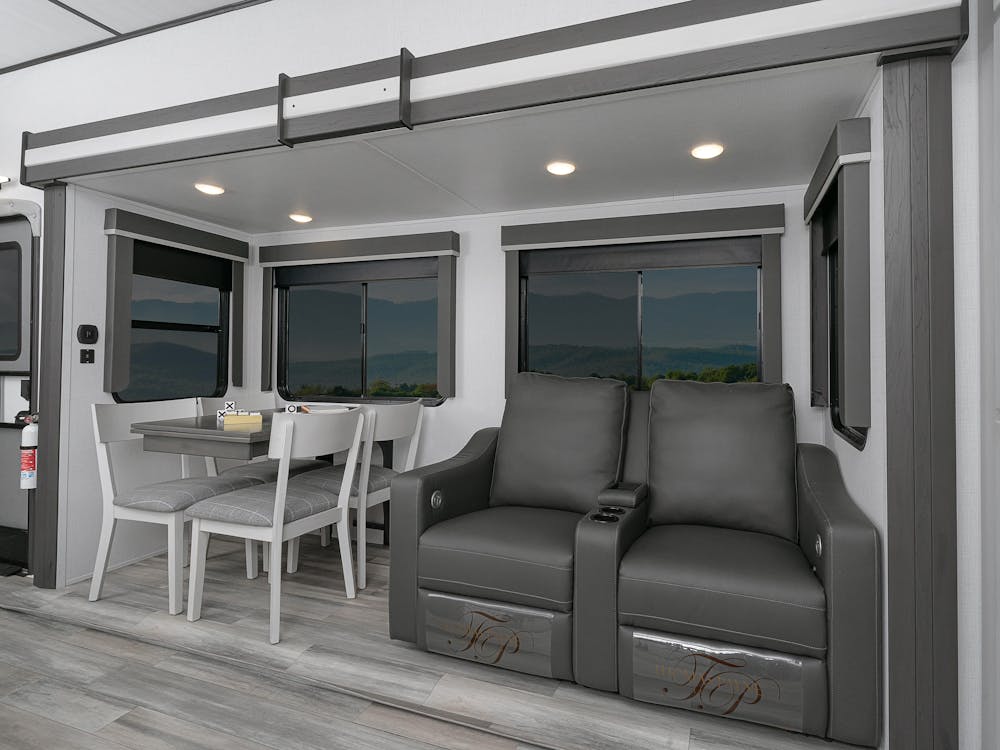 This modern miracle of a fifth wheel features a rear bonus room that easily sleeps five bigger kids thanks to generous bunks above a built-in entertainment center with storage and a dedicated full bath for the bunkroom. On the off campsite side, the back bedroom has a fold-out sleeper sofa with ANOTHER flip-down bunk above. The space is incredibly well configured to also be a family room during the day. The Sprinter Limited 3900DBL has a big kitchen with an oversized microwave, 16 cu. ft. refrigerator and a second kitchen and refrigerator outside. Three awnings cover a whopping 27' to extend your living space. You might also consider Sprinter Limited's 3630BHS which is a similar layout, minus the rear bath.