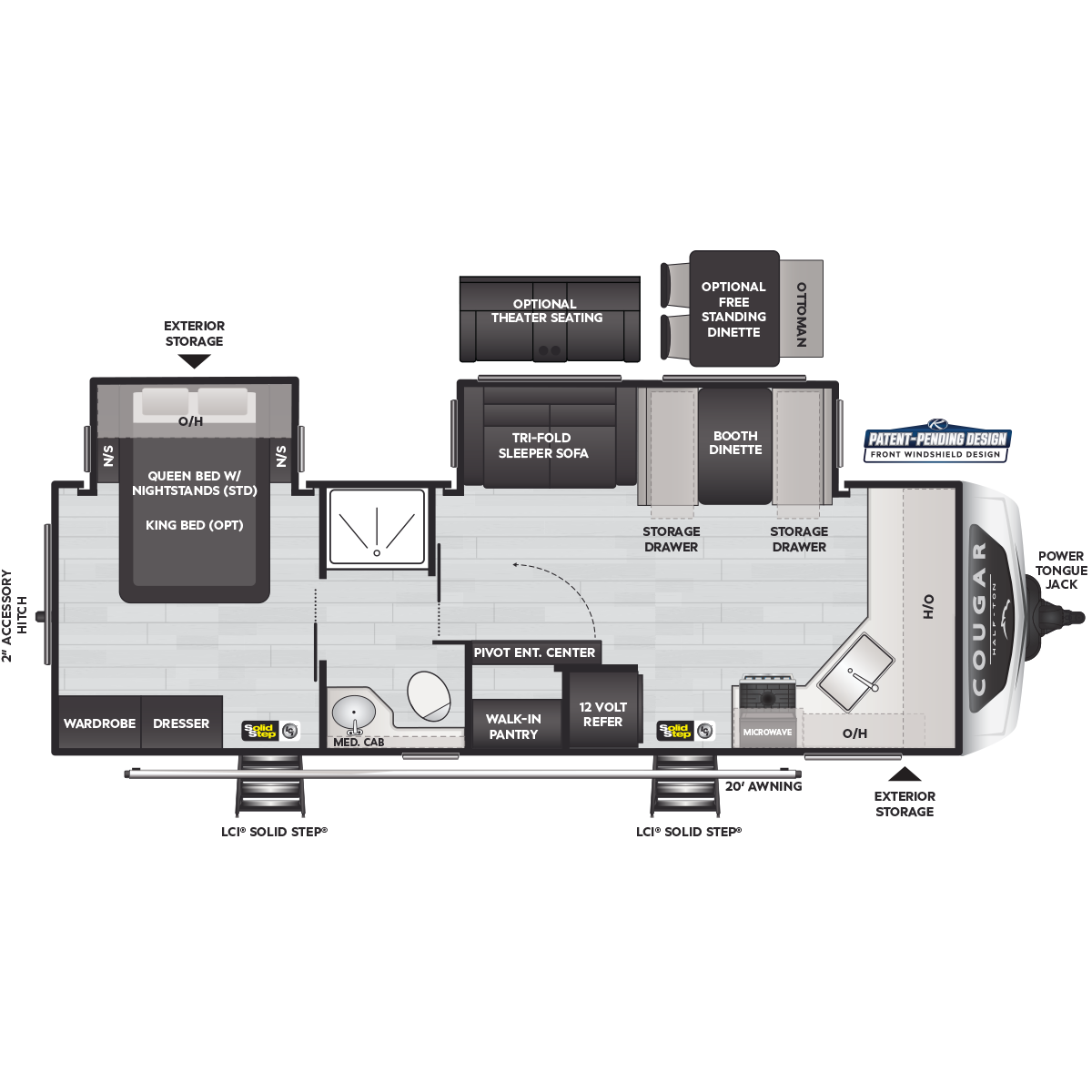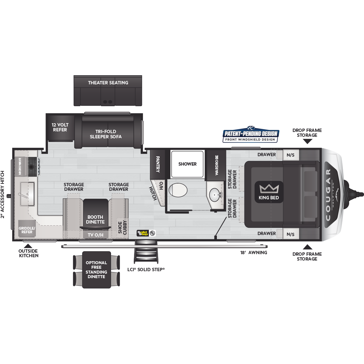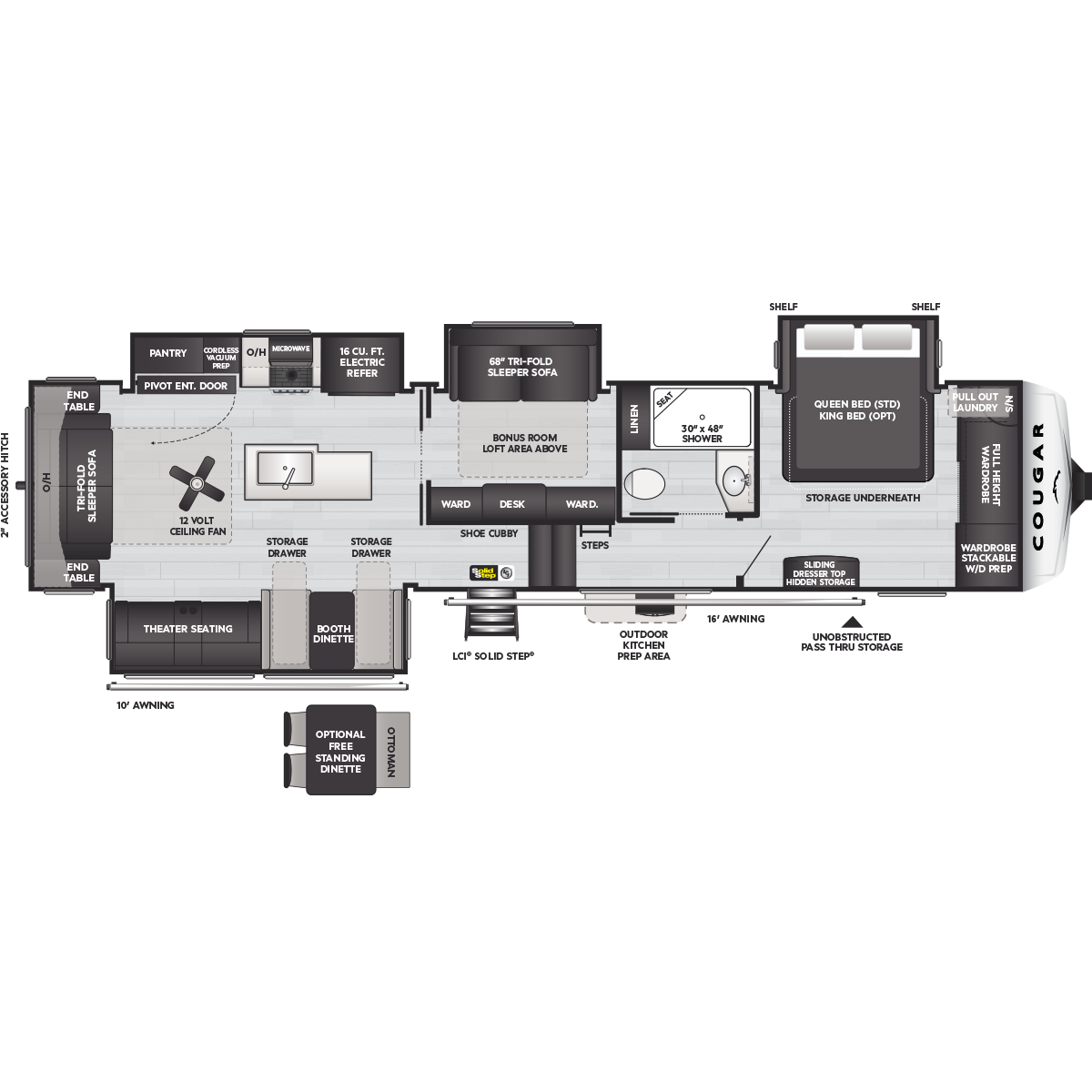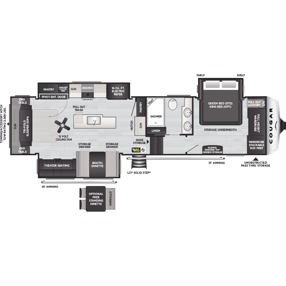 Come to Keystone RV Booth 2 with Camping World to see all of these floorplans! Step into the legacy of RVing with the iconic Keystone Cougar. Our collection invites you to join generations of campers who have trusted Cougar as their choice for extraordinary journeys. With a range that includes fifth wheels, half-ton fifth wheels, and travel trailers, Cougar stands as a leader in the industry, embodying not just a brand, but a tradition of innovation, style, and unforgettable experiences.