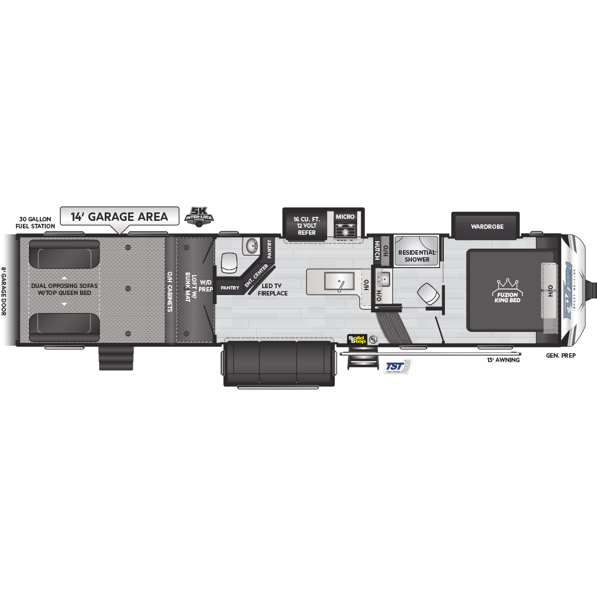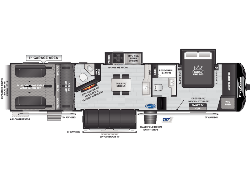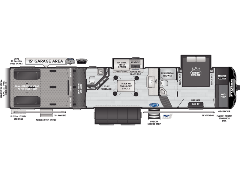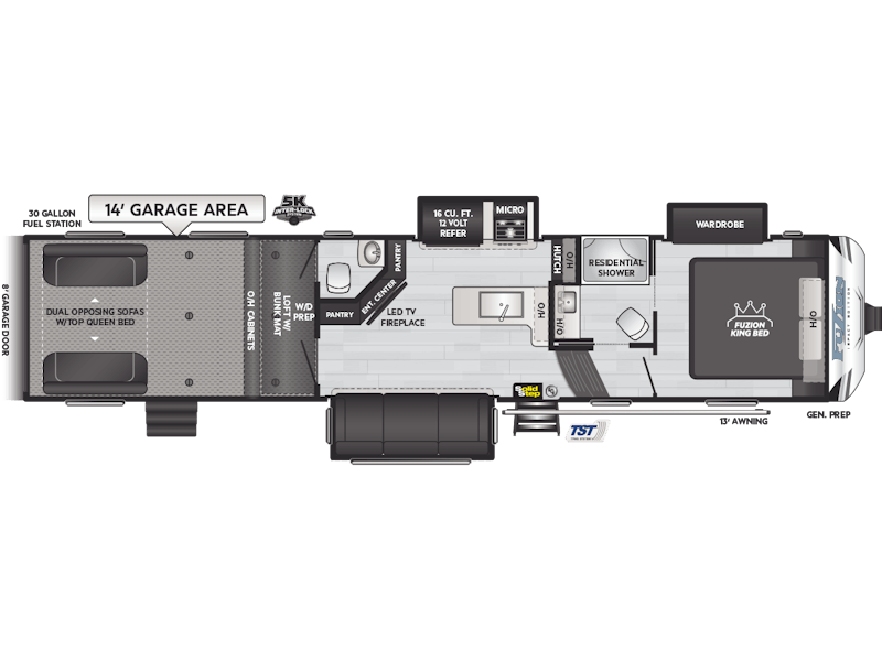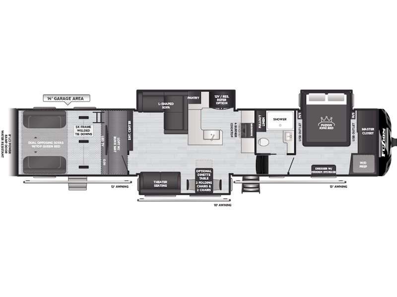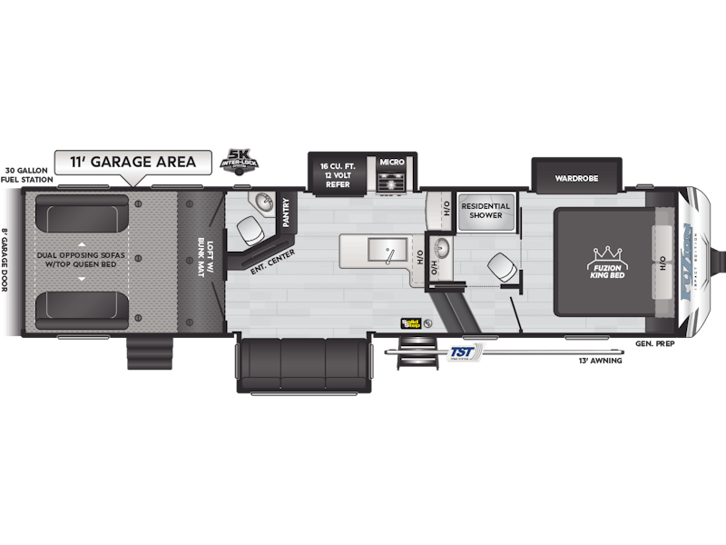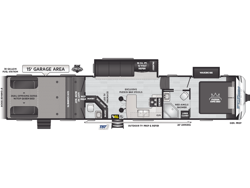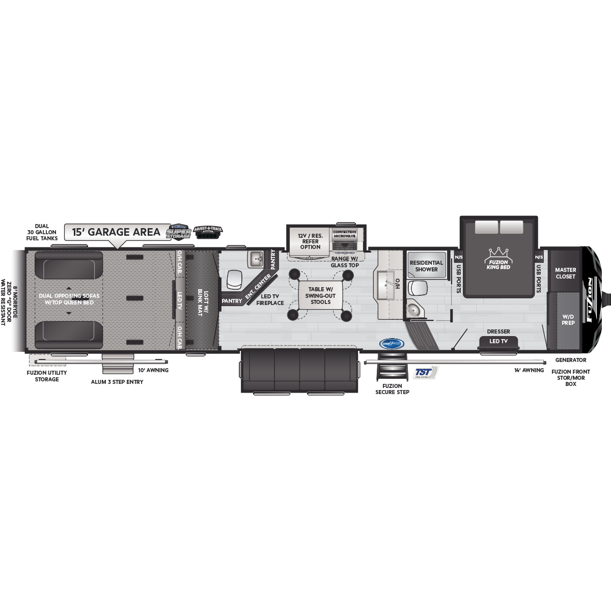 Come to Keystone RV Booth 3 with General RV to see all of these floorplans! Part of the Key Performance™ toy hauler collection, Keystone Fuzion and Impact models bring heart-pumping style, pioneering floorplans and the best RV garages, specifically engineered for power sports enthusiasts. Whether you're hauling dirt bikes, ATVs, motorcycles or golf carts, our frame-welded, Adjust-A-Track™ tie-downs feature multiple connection points to fully secure the widest range of vehicles. Everything you need to get out and get after it! The Fuzion family includes Fuzion Luxury Toy Haulers, and Fuzion Impact Series fifth wheels, laminated- and aluminum-sidewall travel trailers.