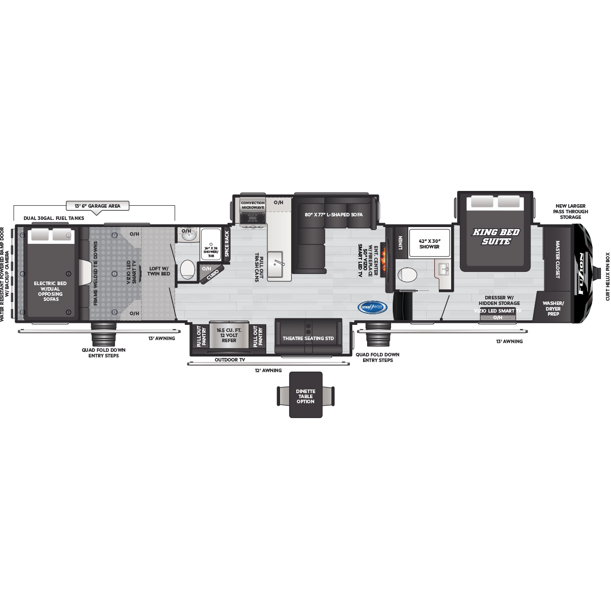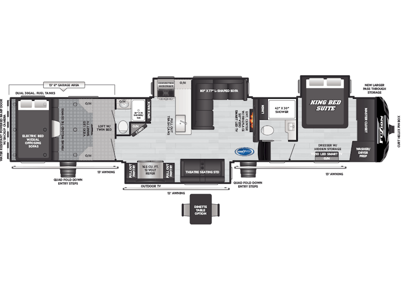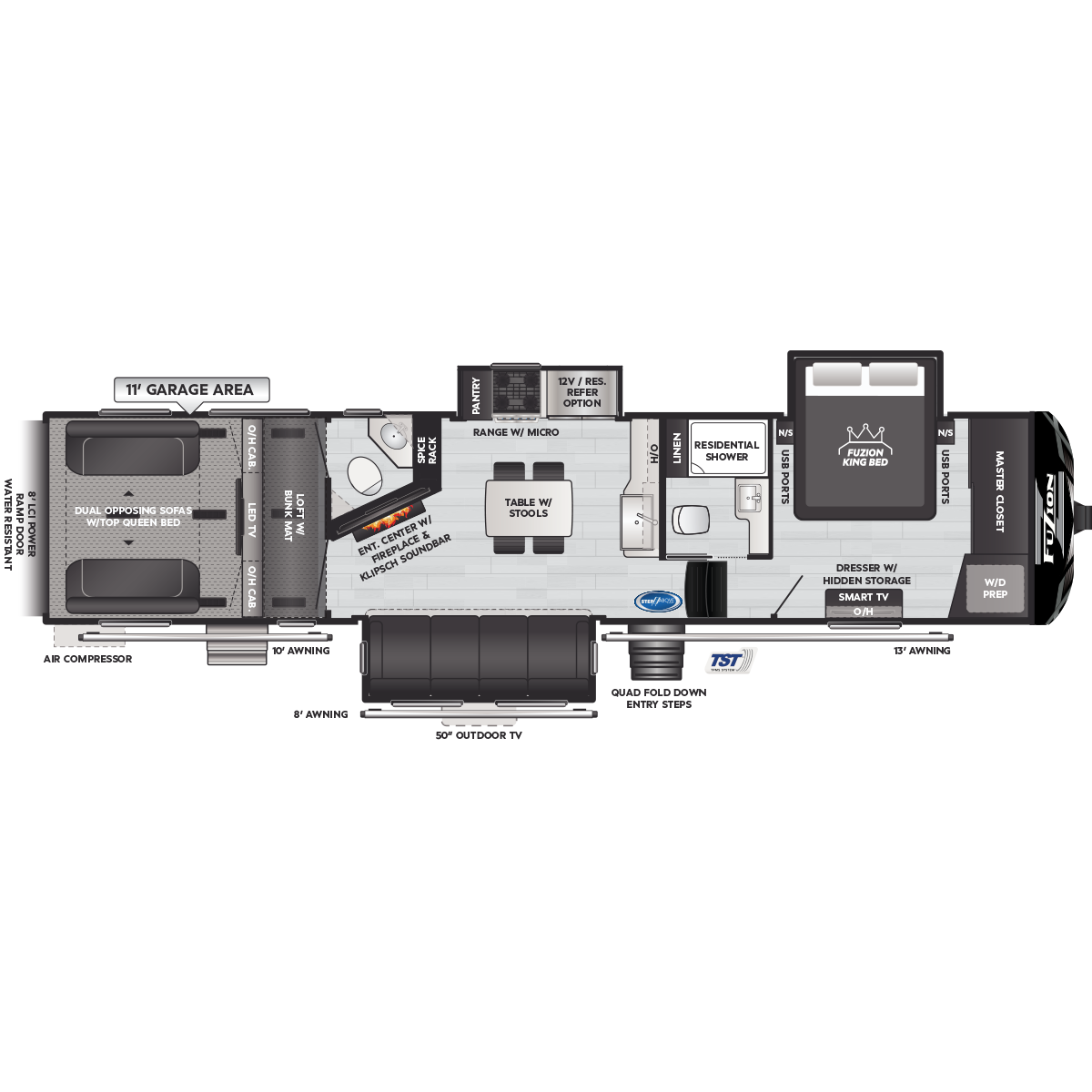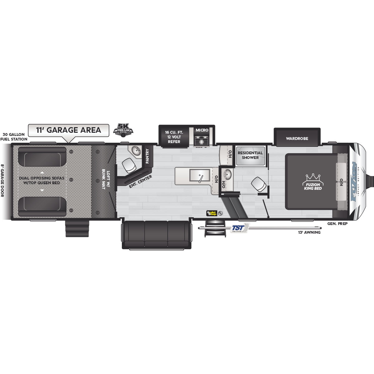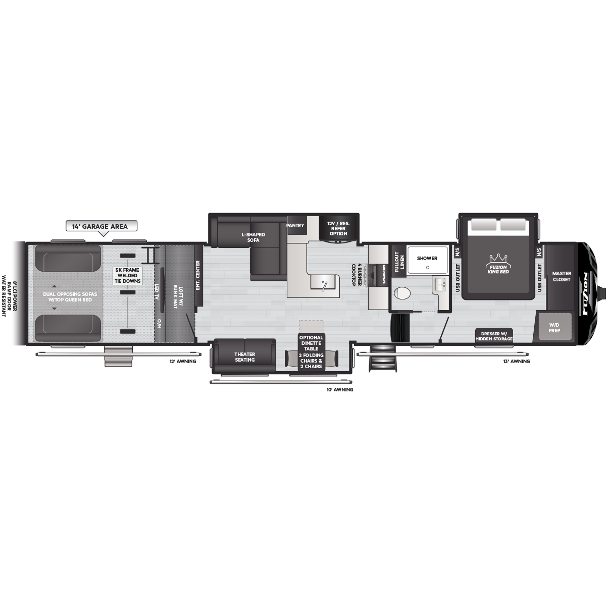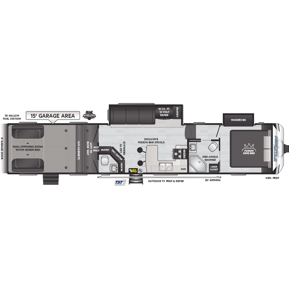 Come to Keystone RV Booth 3 with General RV to see all of these floorplans! Part of the Key Performance™ toy hauler collection, Keystone Fuzion and Impact models bring heart-pumping style, pioneering floorplans and the best RV garages, specifically engineered for power sports enthusiasts. Whether you're hauling dirt bikes, ATVs, motorcycles or golf carts, our frame-welded, Adjust-A-Track™ tie-downs feature multiple connection points to fully secure the widest range of vehicles. Everything you need to get out and get after it! The Fuzion family includes Fuzion Luxury Toy Haulers, and Fuzion Impact Series fifth wheels, laminated- and aluminum-sidewall travel trailers.