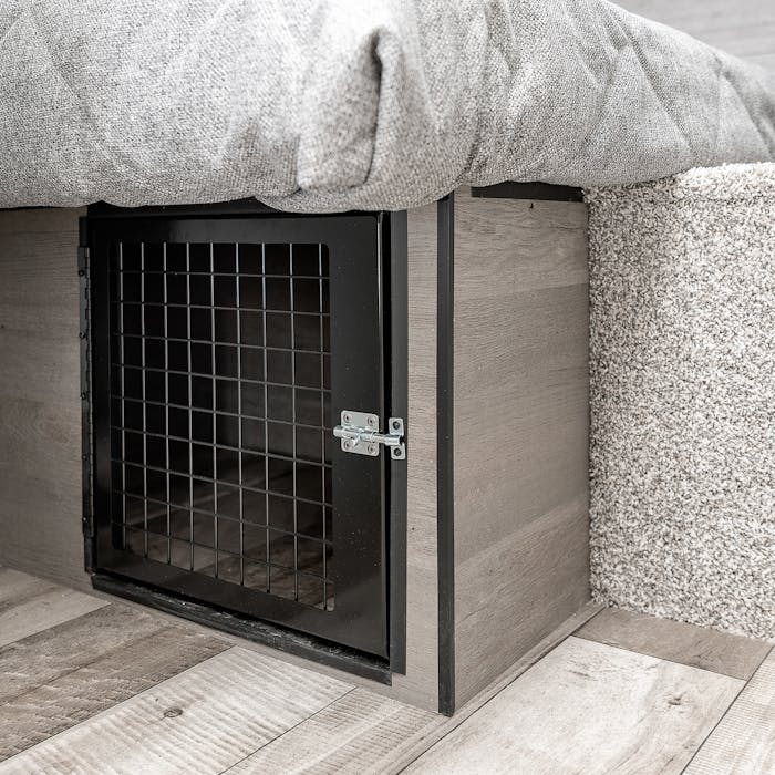 Since 2019, most Outback models have offered pet kennels built into the bed base. The 2021 Outback 244UBH is one of our favorites for pet owners because it also features pull-out dog dishes underneath the entertainment center, a handy outdoor shower to clean muddy paws and no carpeting so a Swiffer is all you need to easily pick up pet hair. At just under 29’ and 5,643 lbs., this model is ultra-nimble and towable.