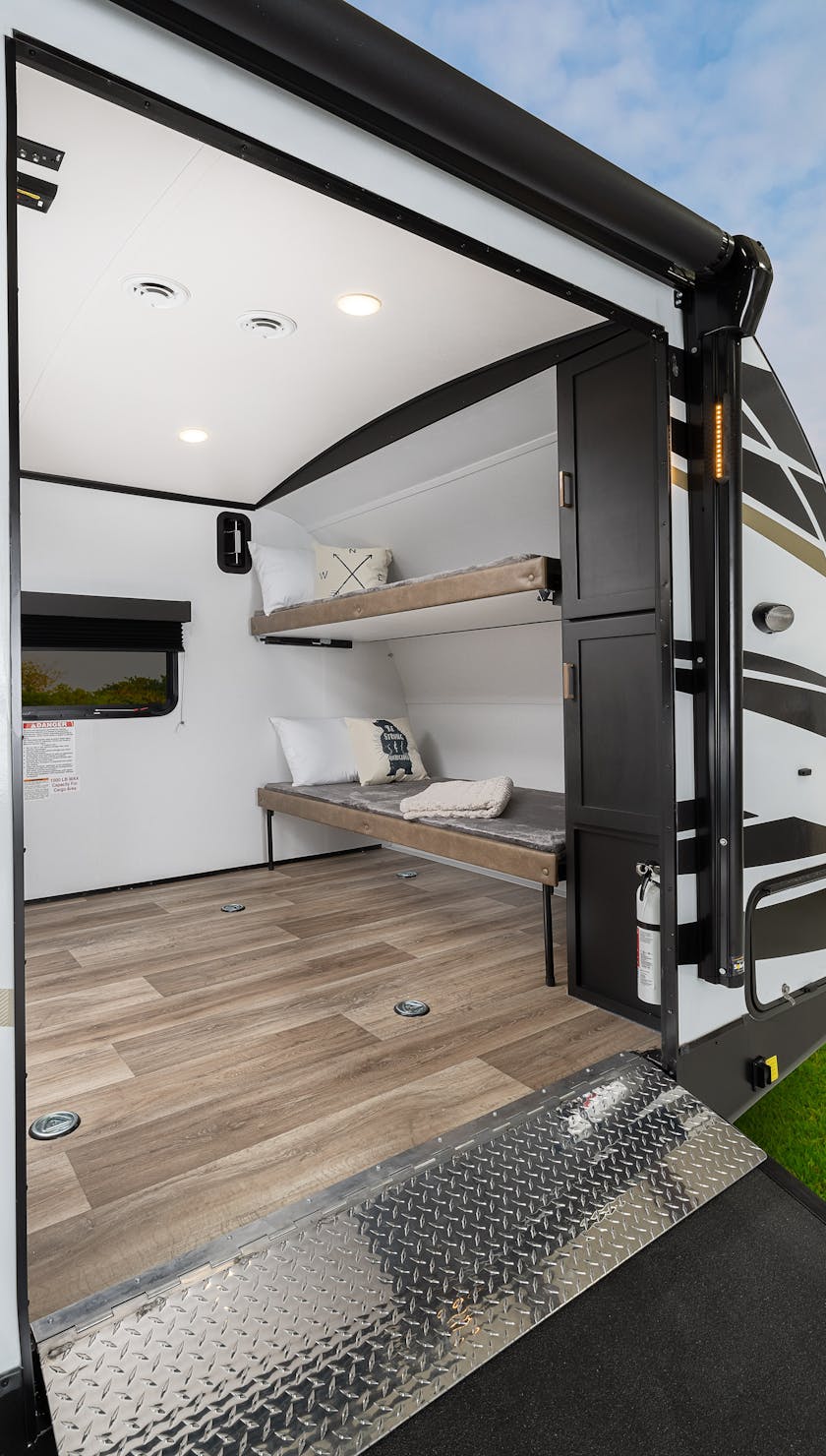 Looking for the perfect bunkhouse to bring a kayak along? The Bullet 312BHS is the perfect addition to our favorite RVs for the active adults lineup! This less than 40ft lightweight travel trailer has the ability to comfortably sleep 9 people, so it is the perfect floorplan for large families or for those who like to travel with friends. It features a rear queen bed lift with a loveseat down below, a pullout couch, a convertible dream dinette, and a queen bed in the main bedroom. The rear cargo door is perfectly sized to slide in a kayak or a bike (even with the slides in) so that you can have the adventure of your dreams.