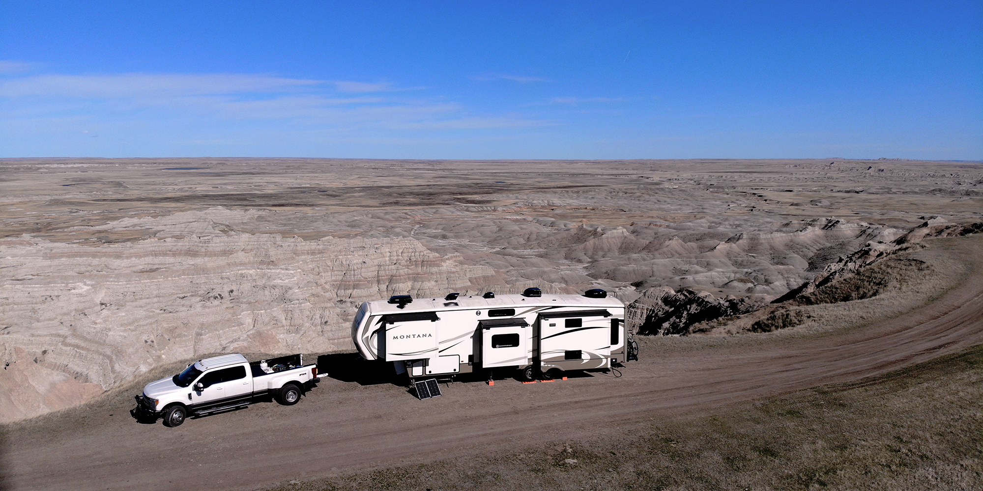 Montana fifth wheel parked in the Badlands with solar panel propped on ground.