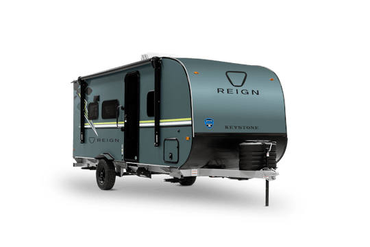 Despite its size, Reign’s interior design offers ample storage and space for all the necessities. Its effortless, ergonomic storage solutions create additional space in unexpected places, from underbed storage to unique shelving and cabinetry. The kitchen features heavy duty thinscape composite countertops, which can also be found around the bathroom sink. Paired with the European inspired interior design, bringing a unique offering unlike anything else in the industry, the dimmer line lights offer campers a range of mood lighting throughout the day.